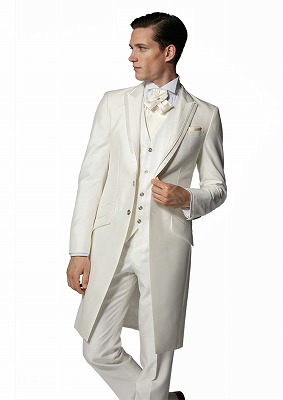 タキシードよりもフォーマル感が高く感じられることも多く、850番のようにオールホワイトの3ピースならセレモニーにふさわしい風格が漂います。