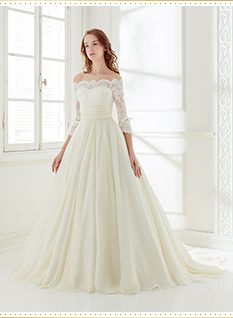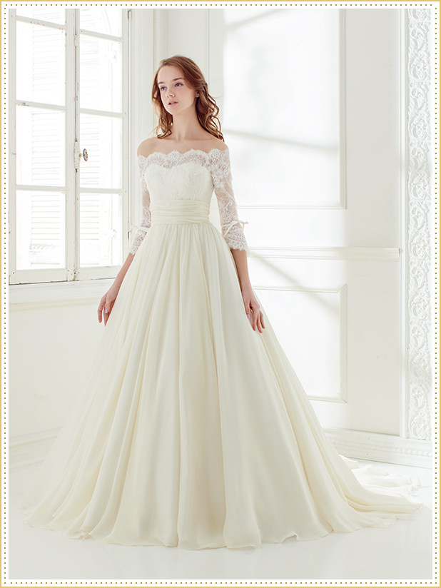 全40通りのスタイルはオーセンティックな王道系からカジュアルテイストなものまでさまざまで、例えば(1:FR037)にクラシカルなパコダスリーブを合わせた(3:X10037+FR037)とトランスペアレントなショルダースリーブをミックスした(4:X10044+FR037)では、全く別のドレスのように印象がシフトする。