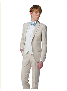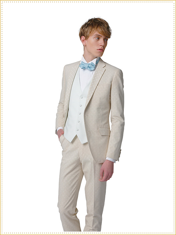 ポイントは、程よく個性を輝かせてくれるファッショナブルなベスト。例えば普段からカジュアルテイストな装いを好む花婿には、1(20346)や2(20332)といったチェック柄のプリントベストがお似合い。シックなフォーマルウェアにデイリー要素を取り入れてくれるアイテムで、適度に力の抜けたルックに導いてくれる。