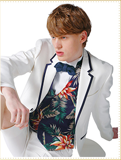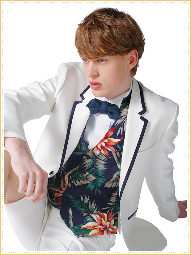 まろやかな光沢を放つピンクシャンパンの装いをブラウンカラーのベストがぴりっと引き締め、スタイルアップにも活躍するまた開放的なビーチウエディングを予定しているなら、4(20356)のボーダー柄や5(20362)のボタニカル柄といったリゾートテイストなベストも注目。多彩にそろったデザインが、オリジナリティが光る晴れの日の装いを約束してくれる。