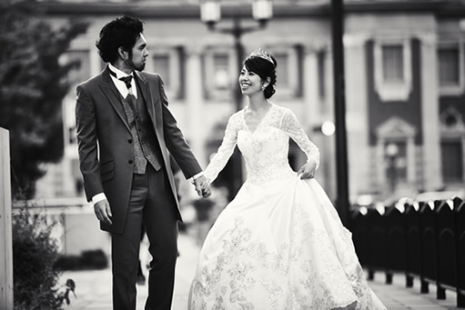 艶感の美しいグレーのロングタキシードと銀糸が煌めくロングスリーブのAラインドレスはロイヤルウエディングを彷彿させます。