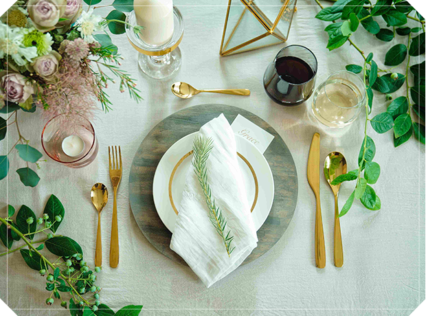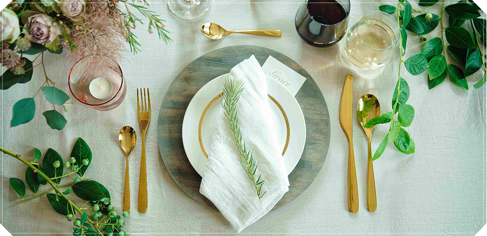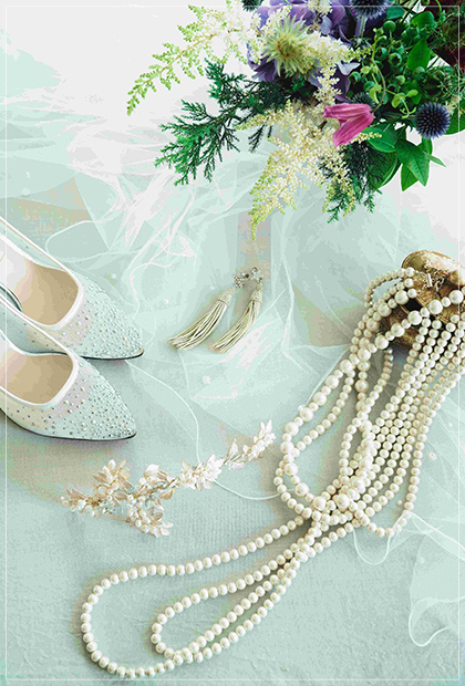 花嫁のアクセサリーもテーブルセットのカトラリー類とカラーリンクするようにゴールドからクリーミーなオフホワイトで揃えれば、春らしい温もりを表現できます。