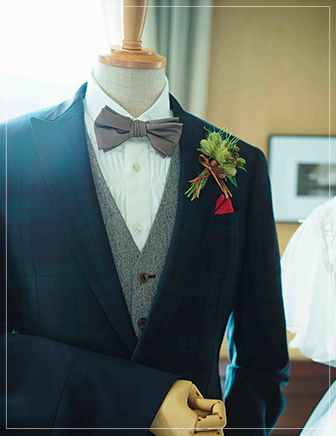 タキシードのベストとカラーを合わせたグレーのハットは、入場時に少しおめかししてかぶった後は、ディスプレイとしてさり気なく配置することも。