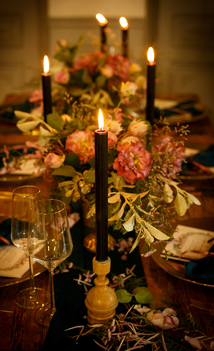 そこに配されたテーブルには、おふたりとご家族の人数分だけのテーブルセット。テーマカラーに選んだノーブルなネイビーをランナークロスやキャンドルに取り入れ、これから始まる温かな時間を期待でいっぱいのものにしています。