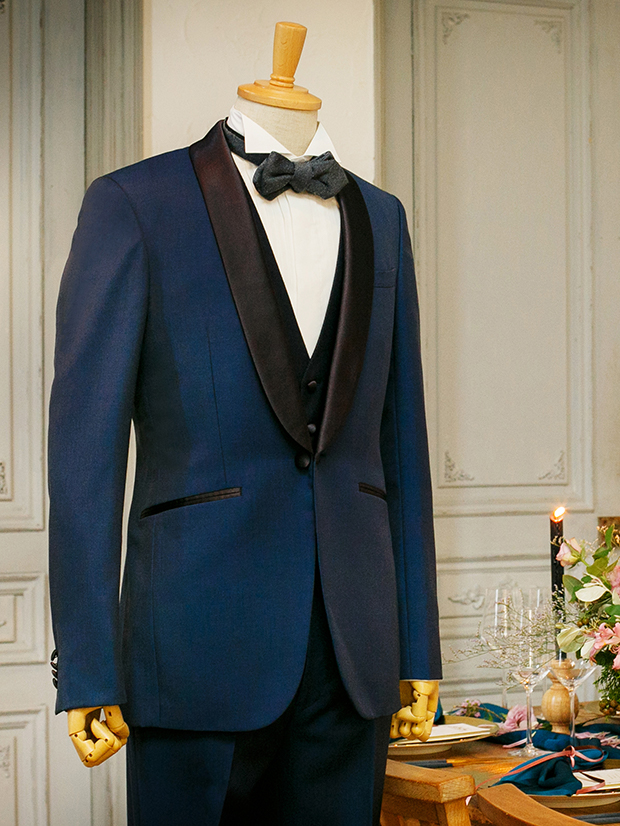 もちろんネイビーは彼のタキシードにも取り入れられました。花嫁のドレスがシンプルながらも構築的なデザインなので、それを引き立てるような上質でミニマルなデザインのタキシードをチョイス。伝統的でスタンダードなショールカラーにキッドモヘアの柔らかな素材感がいきる1着です。